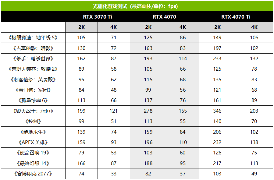 NVIDIA官方给RTX 4070的定位是2K高帧游戏体验,不过我们也加入了4K下的成绩,方便大家参考。来看看在不开启光线追踪的前提下,纯光栅游戏的表现。