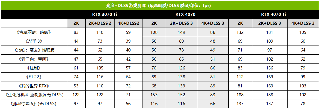 接下来是开了光追和DLSS之后的游戏测试,RTX 4070的表现同样可圈可点。即便不开启DLSS,在2K分辨率下《杀手3》、《地铁:离去》增强版、《看门狗:军团》三款游戏的平均帧率都有56fps,其他的游戏均在60fps以上,由此可见有第三代光追单元的加持之后,RTX 4070光追性能的强悍。而RTX3070 Ti的表现就要明显逊色一大截,多款游戏的平均帧率甚至还不到50fps,画面的流畅性自然就会大打折扣。