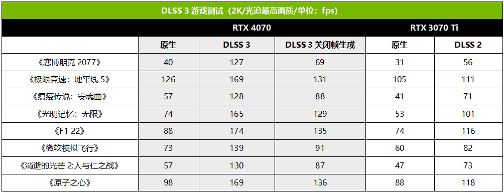 在《光明记忆:无限》和《F1 22》中,开启DLSS3之后,RTX 4070的性能直接实现了翻倍,分别是RTX 3070 Ti开启DLSS2的1.63倍和1.5倍。《微软模拟飞行》RTX 4070开启DLSS3后是原生2K的1.9倍,是RTX 3070Ti的1.7倍。