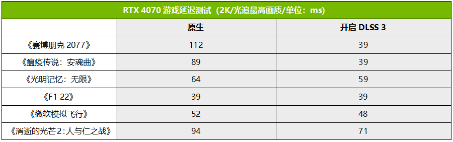 我们知道DLSS 3除了可以大幅提升游戏帧率降低帧延迟外,本身也包含了Reflex,因此综合下来可以显著降低游戏延迟,提升玩家操控的响应速度和流畅度。从FrameView监测的PCL延迟来看,开启DLSS 3后,绝大多数游戏的延迟都大幅下降,像是《赛博朋克2077》的延迟甚至下降了65%,流畅度提升效果非常显著。
