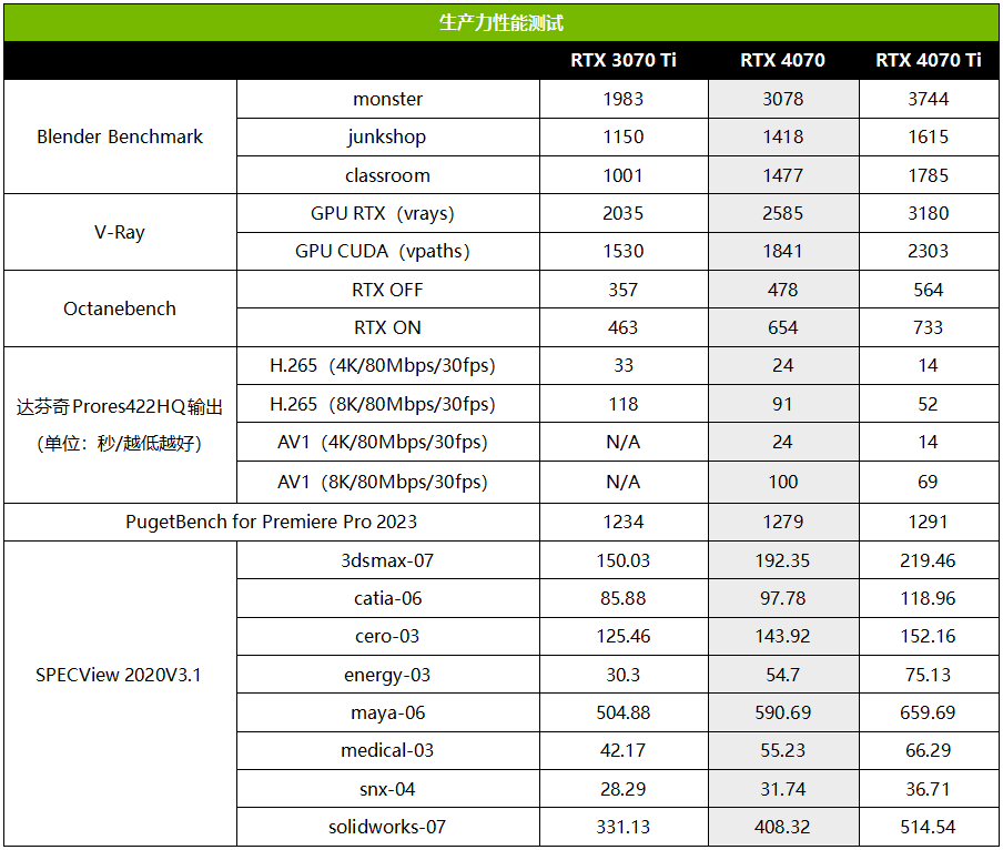 视频剪辑方面,从Premiere Pro 2023来看,RTX 4070也是强过RTX 3070 Ti的。而编码输出方面,RTX 4070新版编码器效率不错,不但支持AV1,而且H.265编码速度也相对RTX 3070 Ti有明显的速度提升。