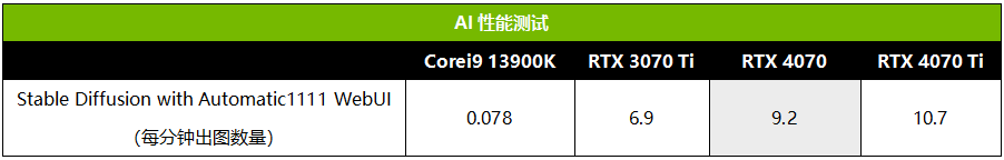 AI应用在今年突然井喷,普及速度之快令人吃惊,未来AI必将成为日常工作必须掌握的技能。我们知道NVIDIA很早就开始布局AI计算,CUDA的生态圈在业界无可匹敌,到了RTX 40时代,更是成为了AI应用的必备利器。这里我们就用Stable Diffusion来测试RTX 4070在AI出图方面的性能。出图的参数配置如图,从测试成绩可以看到,RTX 4070每分钟可以出图9.2张,速度是RTX 3070 Ti的1.33倍,是RTX 4070 Ti的85%。当然,大家也可以看到,CPU很显然不适合作这样的并行计算,就算Core i9 13900K,出图速度也只有RTX 4070的0.9%不到。此外,如果出图分辨率更高,对显卡显存容量的要求也会更高,这方面12GB显存的RTX 4070无疑也比8GB显存的RTX 3070 Ti更有优势。
