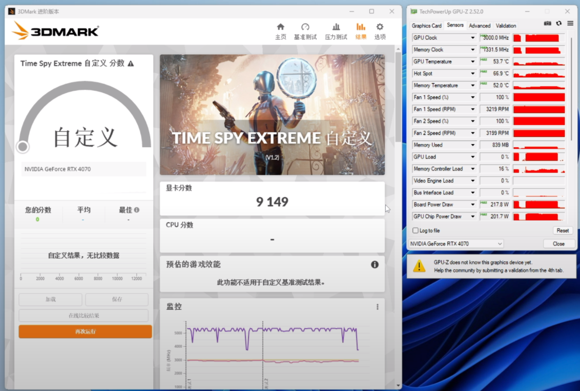 当然这并不是索泰RTX 4070 X-GAMING OC欧泊白的全部实力。通过简单的调校,我们就成功地将显卡的最高频率从2805MHz提升195MHz,达到3000MHz。在此频率下《3DMark》Time Spy Extreme项目的得分从8520分提升到了9149分,提升幅度大约为7%。