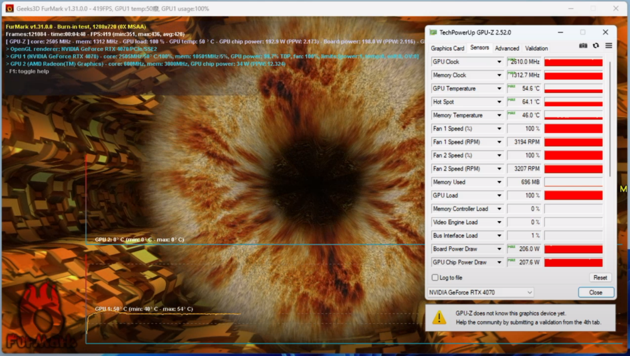 在默认频率下的FurMark考机测试中,核心最高频率为2610MHz,依然是高于参数值。显卡GPU的最高温度也不过54℃,表明索泰RTX 4070 X-GAMING OC欧泊白的散热器具有相当强悍的实力。而且此时整板最大功率也不过刚刚200W出头,表明RTX 4070的功耗控制确实做得不错。