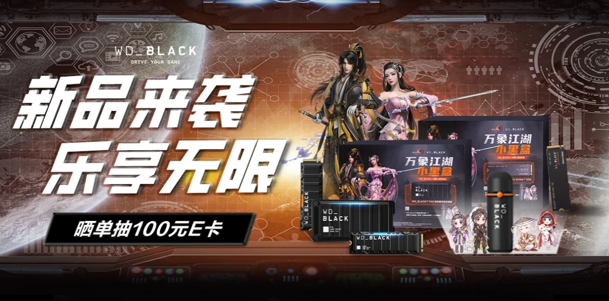 近日,WD_BLACK还携手剑网3为各路英雄们推出WD_BLACK SN850X剑网3礼盒装,包含产品、WD_BLACK定制水壶1个,剑网3江湖相逢【徽章+立牌组合套装】(门派随机)。8月18日开始预售,8月25日正式开售,京东晒单还有京东E卡返还。另外,天猫旗舰店同样有惊喜的新品首发活动,加入店铺会员,可抽盲盒,加入购物车就有机会赢取定制滑板,看直播还能点赞抽红包。别犹豫了,赶紧看看去吧!