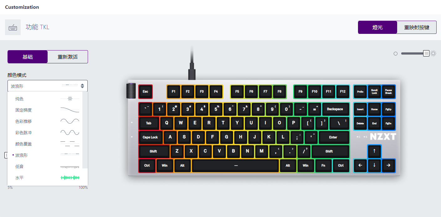 软件的键盘模块中,分为灯光、重映射按键两大功能。首先是灯光页面,软件提供了9种不同的灯效预设,每种预设中又有丰富的调节的选项,按键支持独立动态背光。设置好的灯效可以通过点击或者框选的方式选中你想要应用的单个按键或者区域,操作起来很顺畅。键盘背光的亮度表现出色,放在桌面上可以提供不错的氛围感,但动态光效的流畅度一般,和“灯厂”的机械键盘有一定差距。