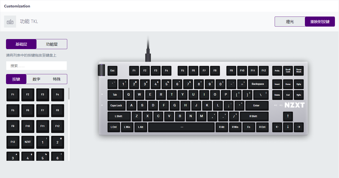 NZXT FUNCTION TKL RGB是一款支持客制化改装的机械键盘,NZXT提供官方的定制服务,包括面板配色、更多的轴体选择以及线材配色等等,可以实现完全定制和个性化。不过对资深玩家来说,自己动手才是最有乐趣的。键盘采用100%标准底行键位设计,可以选择安装不同材质、不同配色的个性化键帽。所有按键轴位置均采用热拔插接口,兼容MX插座的按键轴体,并且每个热插拔底座的上方集成了LED灯珠,这样就能为大多数键轴提供RGB灯光。