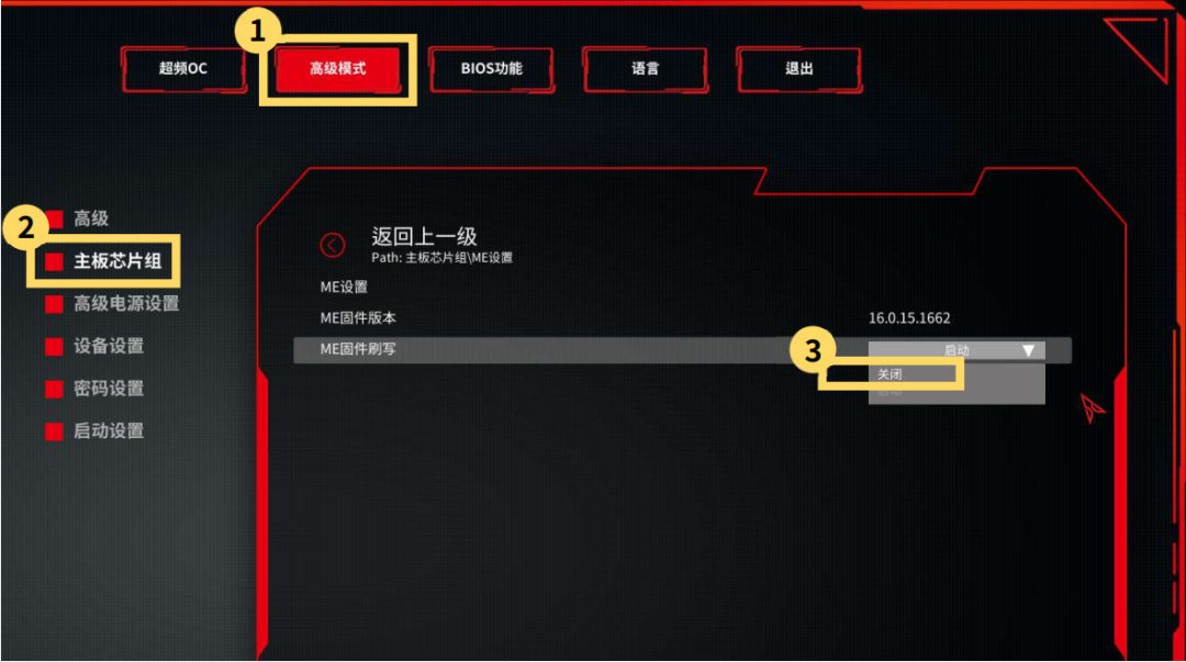 5、重启后进入BIOS主板芯片组界面,确认ME写保护是否已经关闭(ME成功关闭后版本号会变为0.0.0.0)。如果仍未关闭,则需要重复第4步的操作,直到关闭为止。