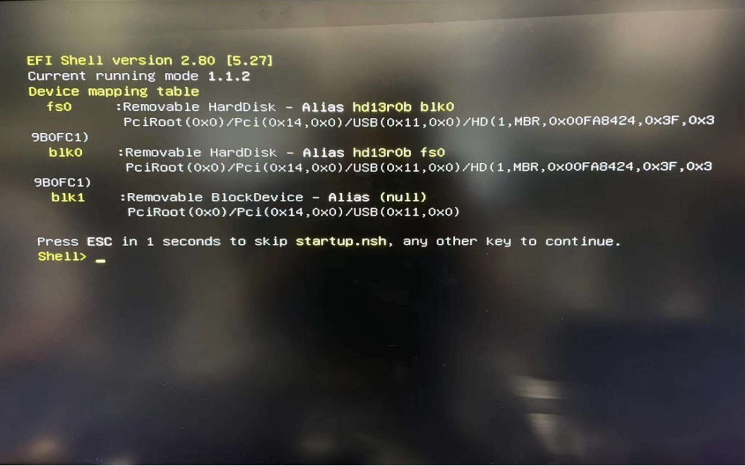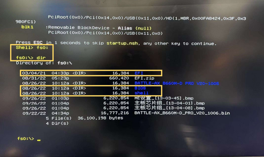 7、进入EFI Shell界面后,先输入“fs0:”或“fs1:”后按回车键,再输入“Dir”或“Ls”后按回车键查看分区下是否有我们提供的刷新文件。