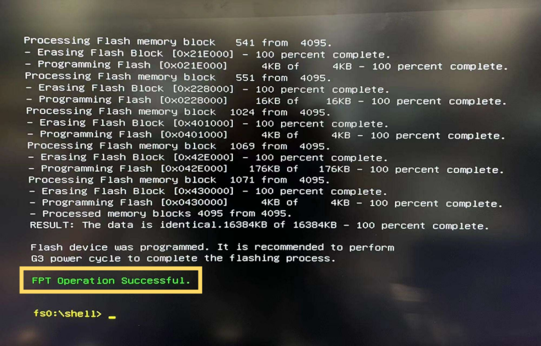 8、如果能读取到保存在U盘根目录的三个文件夹,则输入“cd shell”后按回车键进入到“shell”文件夹,再输入“update.nsh”后按回车键即开始更新BIOS。等 待一段时间后,当界面出现绿色“FPT Operation Successful.”提示语句时,证明BIOS已更新成功,按“Ctrl+Alt+DEL”即可退出UEFI模式。