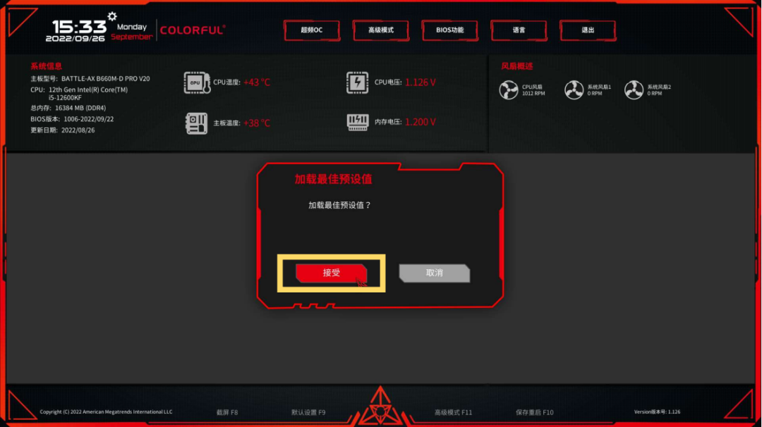 9、重新进入BIOS后,可以看到BIOS版本已升级,按“F9”加载最佳预设值,点击接受,再按“F10”保存退出即可。