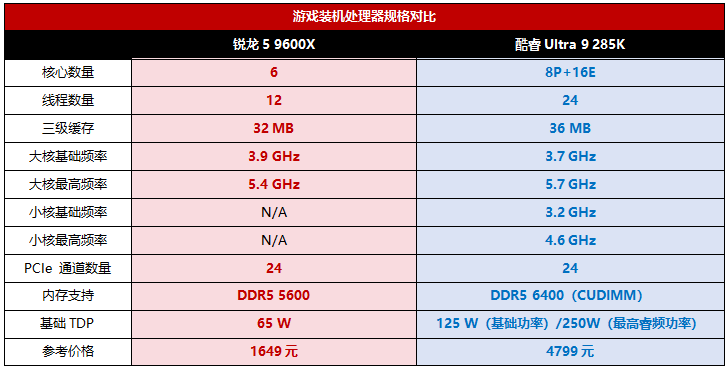 当然,规格分析只是理论层面的,接下来我们就用实际的游戏测试来进行对比,看看锐龙5 9600X的游戏性能是否真的能挑战酷睿Ultra 9 285K这个新旗舰。