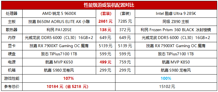 从前面的测试可以看到,锐龙5 9600X在绝对的游戏性能方面已经完胜了酷睿Ultra 9 285K这款新旗舰,对于追求更好游戏性能的主流装机玩家来讲,很显然可以选择价格仅为1649元的锐龙5 9600X来节约大笔的装机预算了。所以有时候价格高并不一定意味着就能提供更好的体验,要从实际出发比较才行。此外,由于锐龙5 9600X搭配的AM5平台相对刚上市的Z890平台也有明显价格优势,同时它对散热器和电源的要求也更低,所以从配置表中也可以看到锐龙5 9600X整机的价格也更有优势,相对酷睿Ultra 9 285K整机节约了5218元之多。锐龙5 9600X拥有更好的游戏性能,更低的装机价格,想必各位主流游戏装机玩家已经知道该怎么选了。