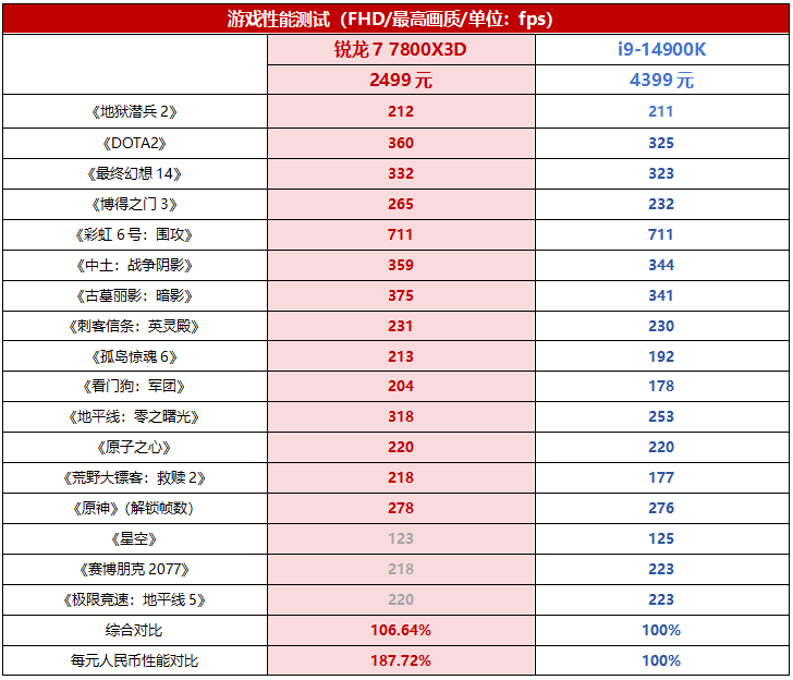 测试使用FHD分辨率并使用旗舰显卡,从而避免显卡形成瓶颈,让两颗处理器都发挥出全部的性能。从实测来看,锐龙7 7800X3D在《DOTA2》《博德之门3》《孤岛惊魂6》《地平线:零之曙光》《荒野大镖客:救赎2》中相对酷睿i9 14900K的帧率优势都超过了10%,在《地平线:零之曙光》《荒野大镖客:救赎2》中的优势甚至超过了20%。综合17款游戏的成绩来看,锐龙7 7800X3D相对酷睿i9 14900K的优势达到了6.64%,基本上等于是完胜了。如果再除以价格,那么锐龙7 7800X3D的每元人民币性能高出酷睿i9 14900K大约87%,性价比方面也是遥遥领先。