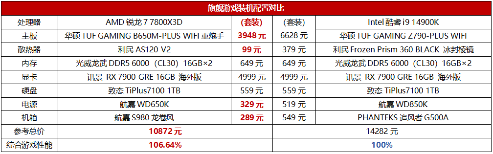那么具体到装机配置方面,我们来看看表中两套配置的对比。锐龙7 7800X3D由于能效比优势遥遥领先,因此可以搭配百元风冷散热器,搭配RX 7900 GRE显卡时也仅需650W电源,同时它的板U套装也拥有2680元的价格优势。而酷睿i9 14900K由于处理器功耗和发热太高,必须搭配360水冷,即便是选择极高性价比的360水冷,价格也比百元风冷贵了不少,同时,它的板U价格也高达6628元,电源方面也至少要850W才稳妥,整机价格顿时比锐龙7 7800X3D主机高出了3410元,性价比方面显然落后很多。