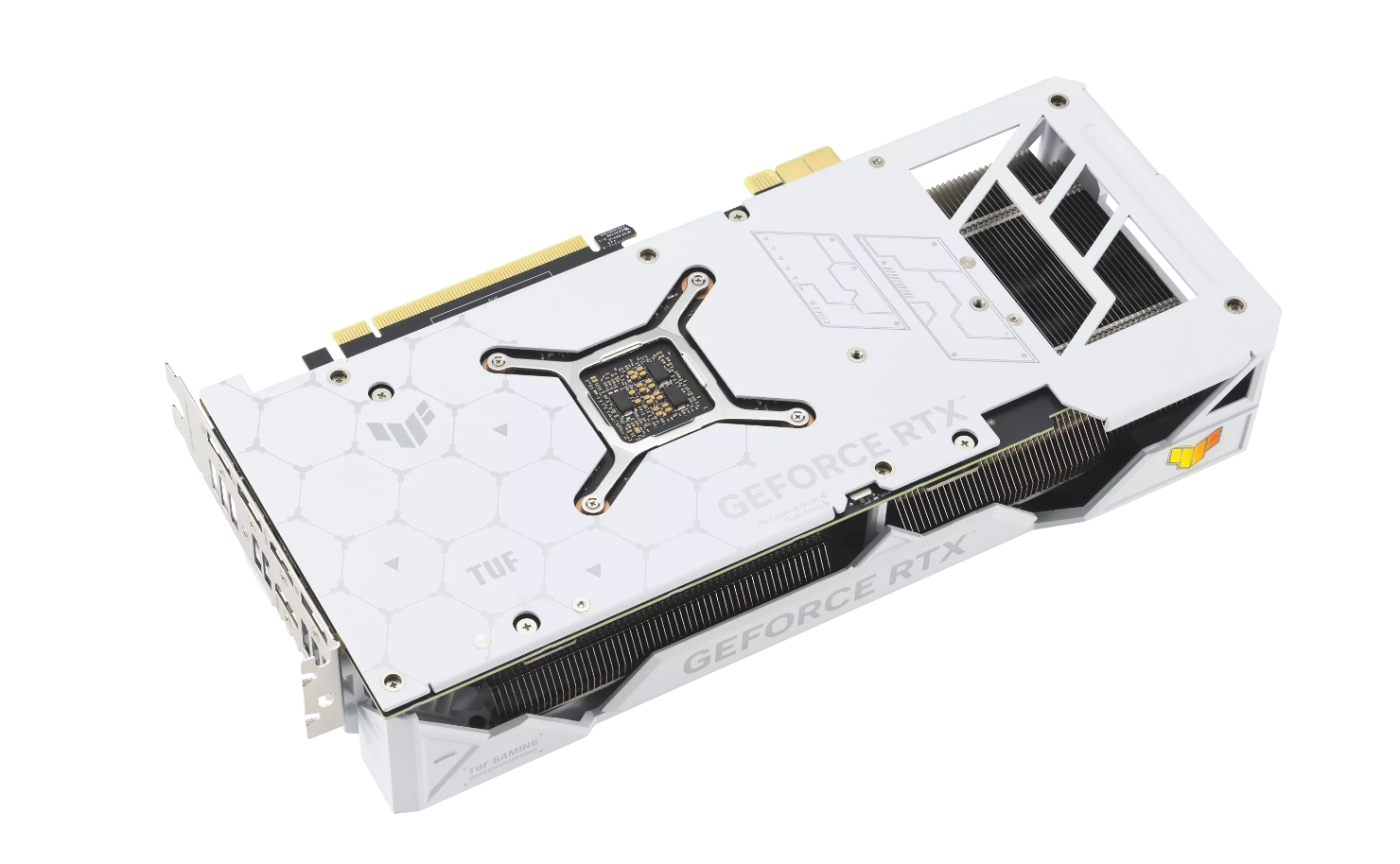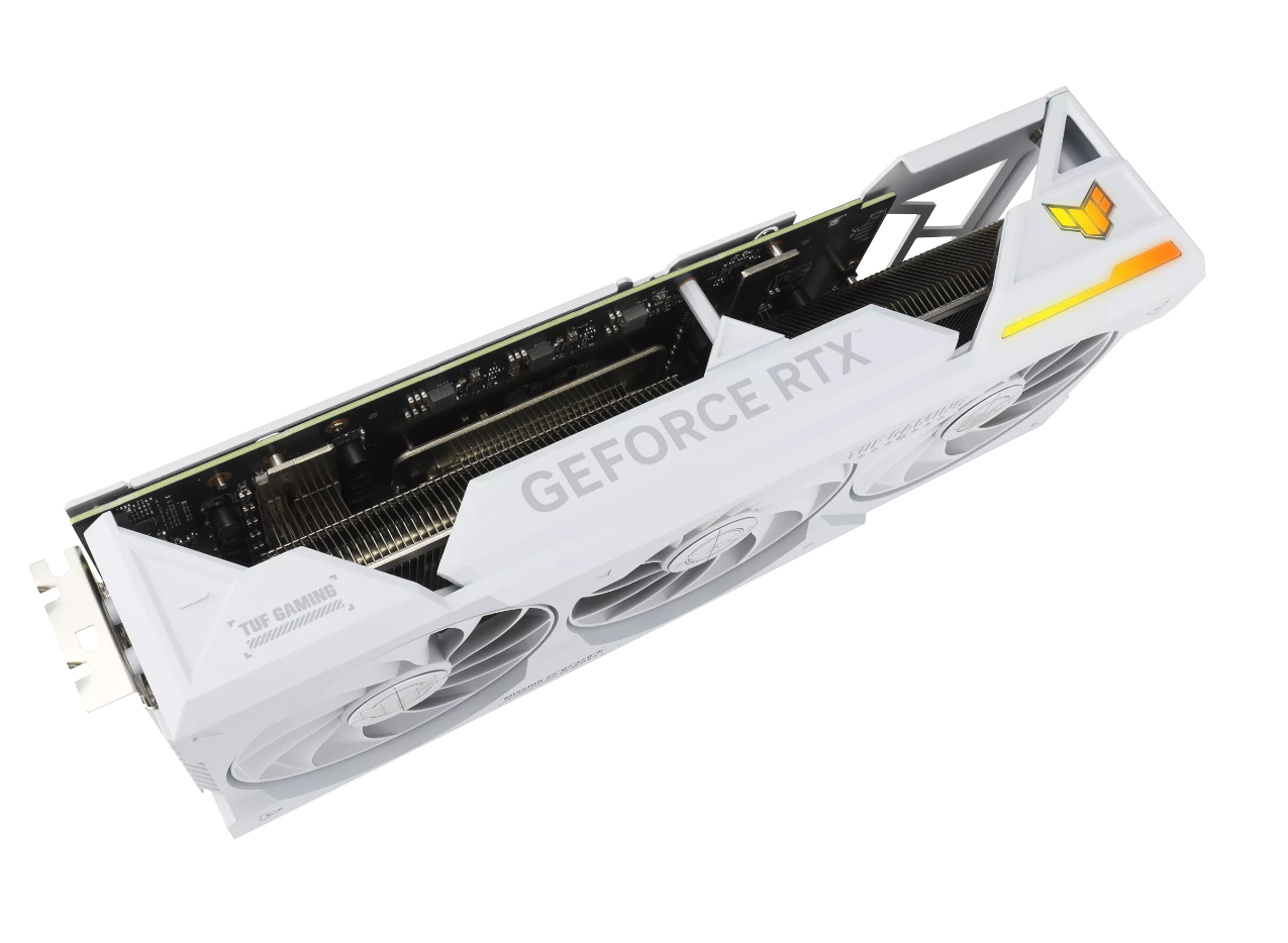 华硕TUF GAMING RTX4070Ti SUPER BTF采用3.25槽厚度设计,热管穿插其中,保证显卡散热。显卡导流壳侧边的开放式设计,配合金属背板尾部的大面积的镂空,能够极大地提高散热效率。同时显卡的导流壳由金属材质打造而成,加上全尺寸的金属背板,大幅提升了显卡的结构强度。