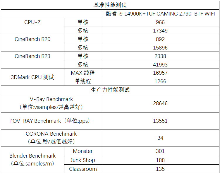 下面,我们就对TUF GAMING BTF 2.0进行性能测试。首先来看看处理器的性能情况。在处理器基准性能测试中,酷睿i9 14900K处理器在《CPU-Z》《Cinebench R20》《Cinebench R23》中的都展现出了强悍的性能。而在生产力性能方面,酷睿i9 14900K在各种生产力软件中的成绩同样非常优秀,完全释放出了旗舰处理器的性能水平。