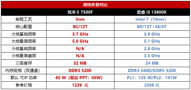 前不久AMD正式发售了锐龙7000中的千元级甜品锐龙5 7500F,它也是首款不带核显的锐龙7000台式机处理器。锐龙5 7500F也采用了5nm Zen4架构,和锐龙5 7600相比只是频率有少许降低,但依然保持了5 GHz的全核频率,性能表现同样优秀。如此一来,锐龙5 7500F就成为了千元U中性价比极高的代表,那要是拿它对上高达2389元的酷睿i5 13600K,游戏性能方面又是谁更强呢?最近要组建主流游戏主机的玩家可以来了解一下。
