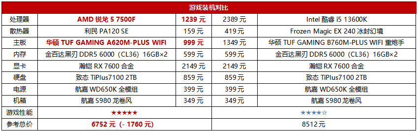综合前面测试的结果来看,锐龙5 7500F的游戏性能大约比酷睿i5 13600K强了4%,作为一款千元U却胜过了售价两千多元的酷睿i5 13600K,这确实重新定义了千元游戏U的性价比标杆。实际上,由于对供电与散热的要求更低,锐龙5 7500F实际装机的时候在散热器、主板方面还能进一步省下预算。例如我们列出的这两套主流游戏装机配置,锐龙5 7500F主机仅需6752元,而同档次的酷睿i5 13600K主机则需要8512元,足足贵了1760元之多,性能反而更落后,性价比谁更高可以说是一目了然。总的来说,如果你现在要打造一套主流游戏主机,那么选择锐龙5 7500F算得上是最实惠、体验最好的选择了。