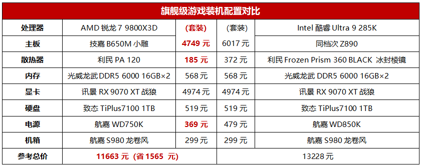 那么具体到实战游戏装机环节,锐龙7 9800X3D和酷睿Ultra 9 285K在整套配置上有些什么差异呢?前面我们说过,锐龙7 9800X3D由于满载功率远低于酷睿Ultra 9 285K,因此在主板供电、散热器和电源方面的要求非常宽松。因此,锐龙7 9800X3D这套配置选用了一个百元风冷散热器和一款750W电源即可,当然主板方面也可以使用B650这样的性价比型号。再者,锐龙7 9800X3D本就相对酷睿Ultra 9 285K有着明显的价格优势,因此整套配置的总价相对于酷睿Ultra 9 285K就节约了多达1565元,已经足够玩家买一款27英寸的4K电竞显示器了。如此可见,玩家选择锐龙7 9800X3D组建旗舰游戏主机,不但游戏性能上远超酷睿Ultra 9 285K,价格方面也有巨大优势,性价比确实很高。