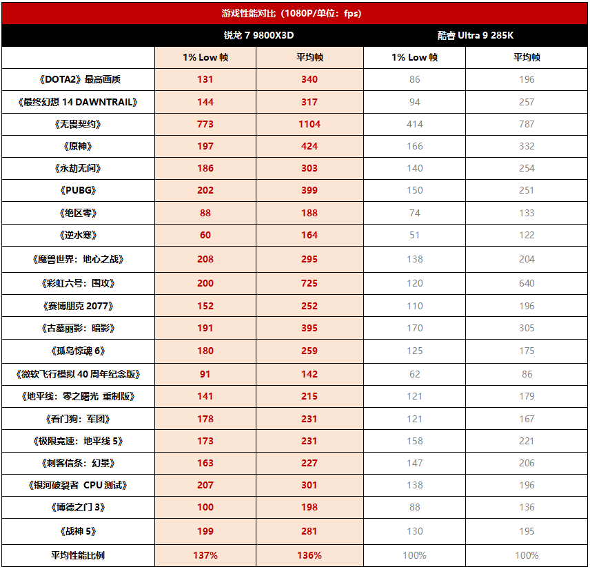 游戏实战测试部分,我们选择了RTX 5090 D,并且使用1080P分辨率,确保显卡不会成为瓶颈。我们测试了21款游戏,锐龙7 9800X3D对上酷睿Ultra 9 285K甚至显得有点欺负人了,在大部分游戏中的平均帧都巨幅领先酷睿Ultra 9 285K,特别是在《无畏契约》、《彩虹六号:围攻》、《最终幻想14:DAWNTRAIL》、《战神5》、《DOTA2》中的领先幅度高达87%、67%、53%和53%,全部游戏的平均领先幅度高达36%。尤其是《无畏契约》,锐龙7 9800X3D的平均帧已经超过1100fps,让玩家的电竞游戏体验从此进入了千帧时代,极高的帧率在电竞网游中无疑能带来更高的操控响应速度,让玩家占尽先机。此外,在游戏流畅度方面也是锐龙7 9800X3D毫无悬念地完胜酷睿Ultra 9 285K,1% LOW帧平均领先幅度高达37%。由此可见,酷睿Ultra 9 285K在游戏性能方面与锐龙7 9800X3D根本没有可比性,已经落后了至少两代的水平。