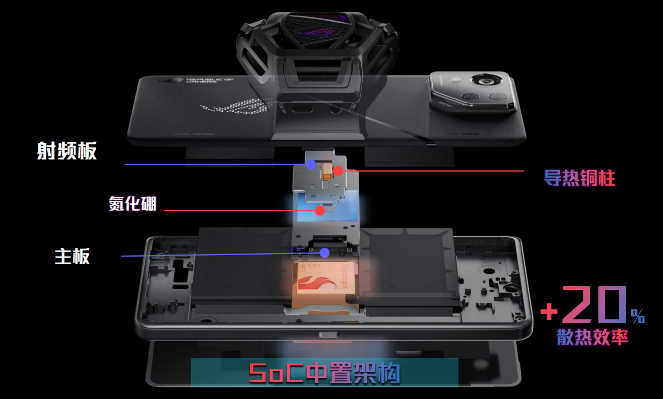 在对手机性能释放至关重要的散热设计方面,由于加入了IP68防尘防水,这意味着ROG 7的对流冷却方案将不再适用。ROG 8 Pro搭载的是全新的矩阵式液冷散热架构8.0,在延续Soc中置设计的基础上,对主板进行打孔再将快速导热铜柱定位在SoC及不锈钢板之间,让SoC产生的热量能够迅速、高效地通过氮化硼冷却材料和铜柱传导至外界环境中,散热效率提升了20%。