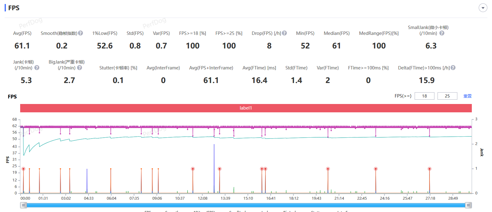 理论性能测试中的优秀表现不禁让我们对ROG 8 Pro实际游戏表现充满了期待,首先测试的是玩家们熟悉的手游大作《原神》。我们在《原神》中以最高画质/60fps模式下,进行了连续半个小时的跑图测试,测试地点为须弥主城。ROG 8 Pro游戏平均帧率达到了61fps。从统计图表中可以看到,测试中的大部分时间都能维持在60fps以上的帧率,整个过程中没有明显的卡顿,游戏体验比较不错。