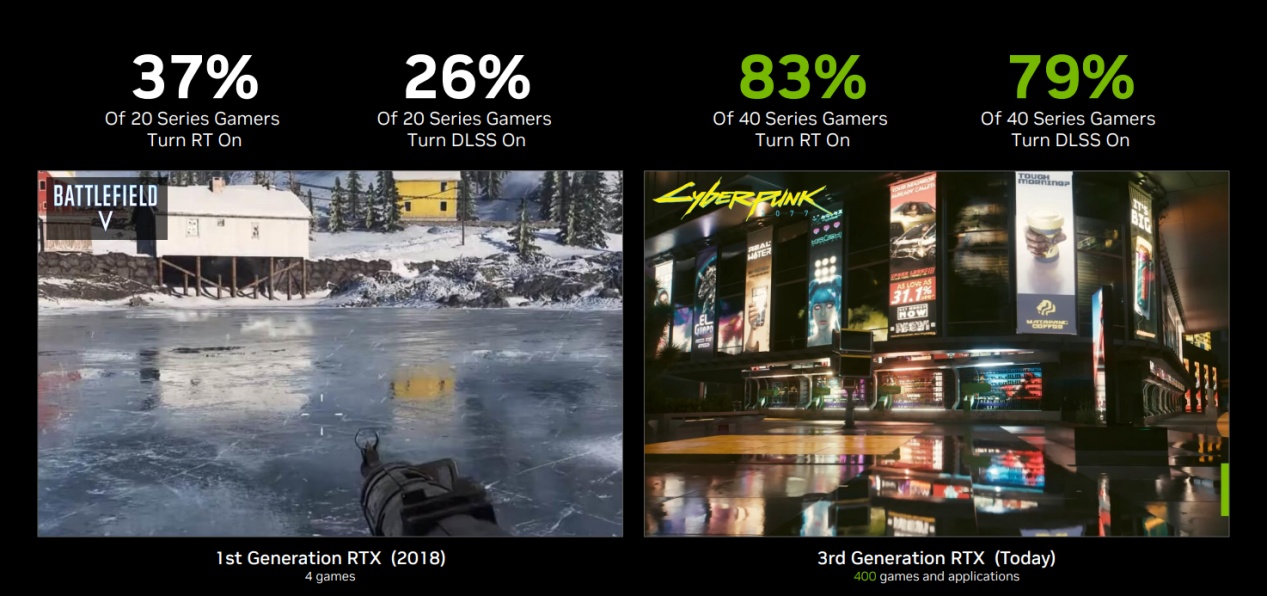 RTX系列GPU刚推出时,只有37%的RTX20系列玩家启用光追、26%的人在游戏中启用了DLSS。而至今为止有超过400个RTX加速的游戏、应用和数以百万计的RTX玩家。目前,83%的RTX40系列玩家都启用了光追、高达79%的玩家都启用了DLSS,可见RTX技术发展势头惊人。