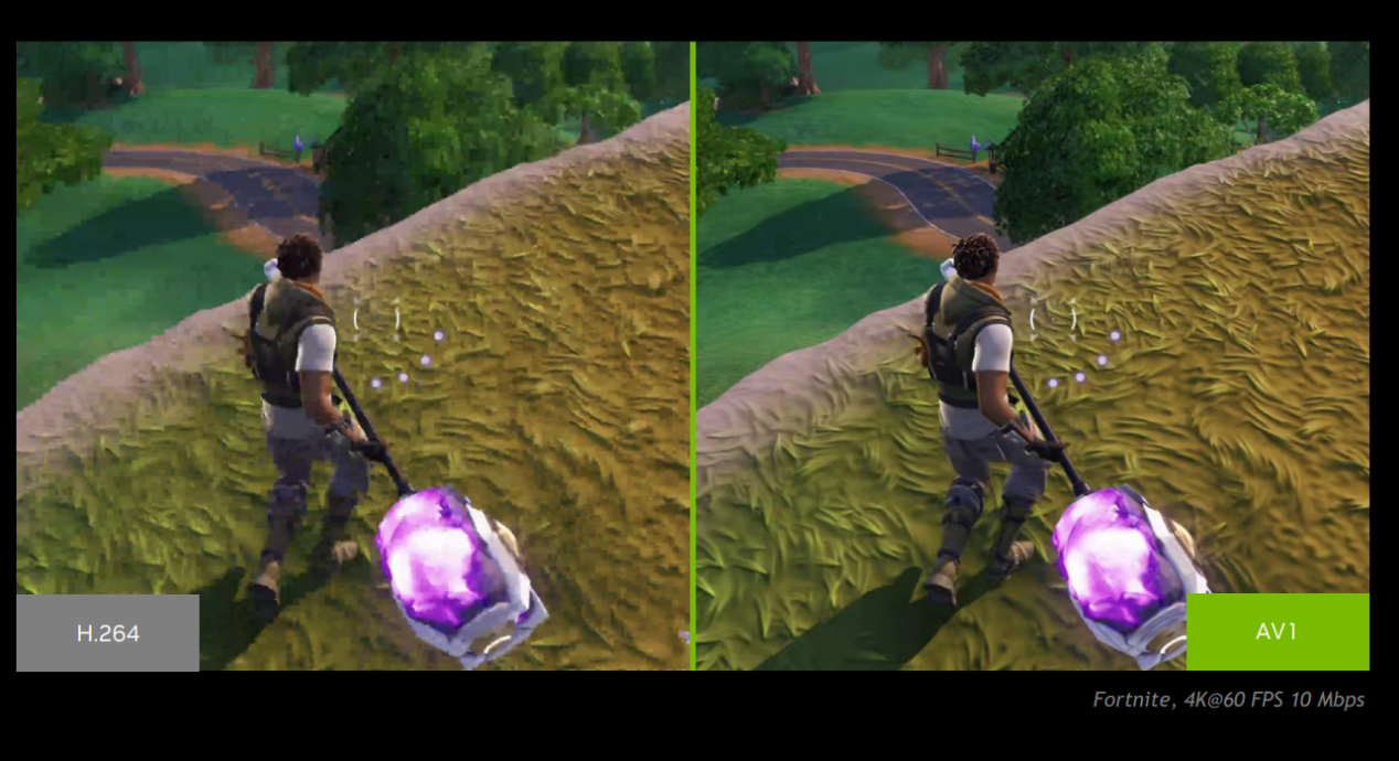 说到RTX 4070的AV1硬件编码,就不得不提同码率下AV1相对H.264的画质优势。从我们录制的《赛博朋克2077》游戏视频截图对比(都为4K/60fps/10Mbps码率)来看,AV1编码画质可以说是好出H.264几个档次,整个画面的精度差异非常明显。可见对于有视频转码需求的用户来讲,支持AV1硬件编码的RTX 4070无疑更加值得选择。