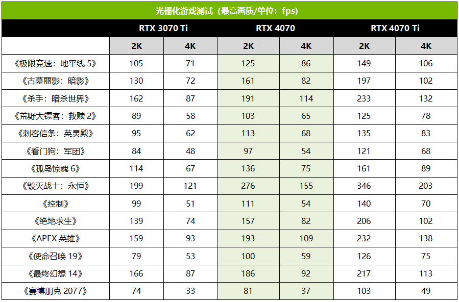 NVIDIA官方给RTX 4070的定位是2K下超过100fps的游戏体验,不过我们也加入了4K下的成绩,方便大家参考。综合来看,纯光栅游戏中,RTX 4070在2K下相对RTX 3070 Ti的提升大约为9%~38%,平均提升幅度为19%,4K下提升14%。和RTX 4070 Ti相比,2K和4K下分别是它的81%和80%,可以说定位非常精准。