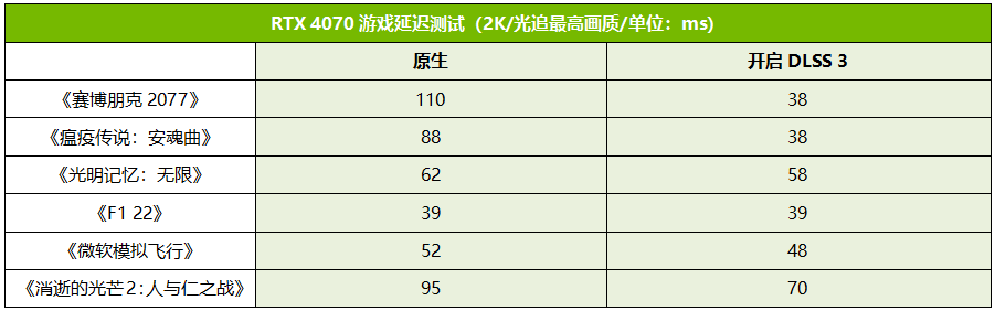 此外,从FrameView监测的PCL延迟来看,开启DLSS 3后,绝大多数游戏的延迟都大幅下降,像是《赛博朋克2077》的延迟甚至下降了65%,流畅度提升效果非常显著。