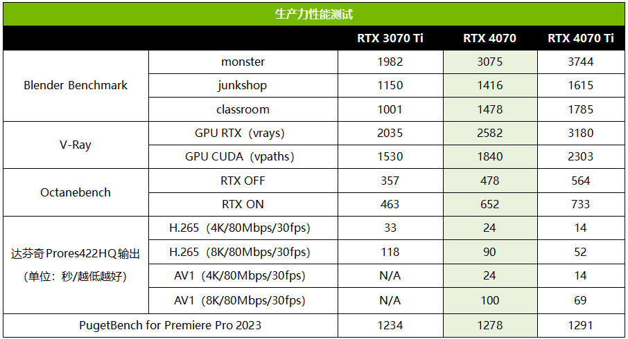 视频剪辑方面,从Premiere Pro 2023来看,RTX 4070也是强过RTX 3070 Ti的。而编码输出方面,RTX 4070新版编码器效率不错,不但支持AV1,而且H.265编码速度也相对RTX 3070 Ti有明显的速度提升。