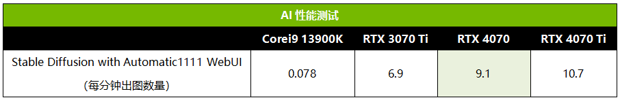 AI应用最近非常火热,我们用Stable Diffusion来测试RTX 4070在AI出图方面的性能。从测试成绩可以看到,RTX 4070每分钟可以出图9.1张,速度是RTX 3070 Ti的1.32倍,是RTX 4070 Ti的85%。而Core i9 13900K出图速度也只有RTX 4070的0.9%不到,可见这方面RTX 4070也是非常高效的存在。