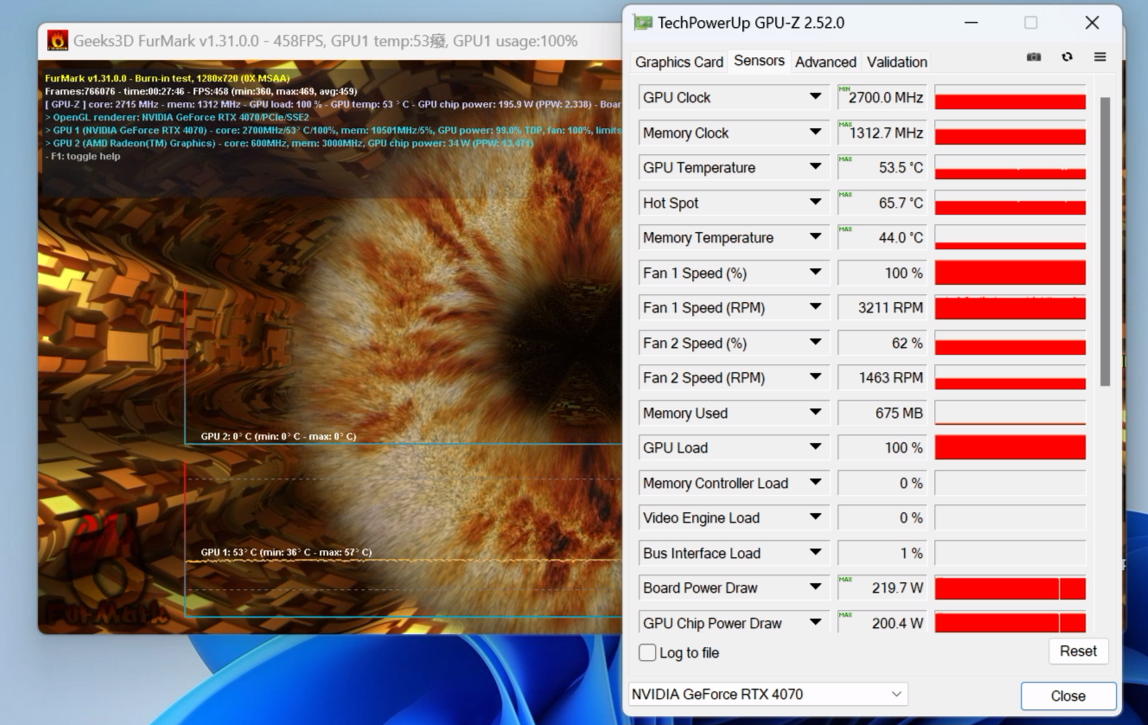 功耗测试部分,技嘉RTX 4070 AERO 雪鹰 12GB默认考机满载频率2700MHz,整板满载功率最高219W,最高核心温度仅有53.5℃,显存温度更是只有44℃,可见散热性能非常强悍。