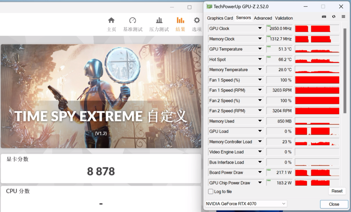 3DMark测试中,技嘉RTX 4070 AERO 雪鹰 12GB最高频率可达2850MHz,最高功率217.1W,不过实际游戏中很少会达到功率上限,一般在200W以下就能发挥出全部性能,可见RTX 4070的能效比是非常出色的。