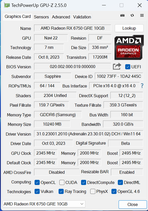 显卡:蓝宝石RX 6750 GRE 10G D6白金版