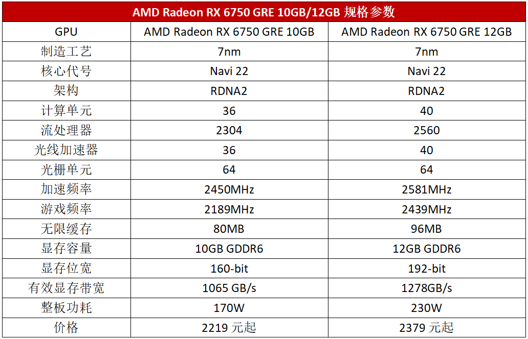 AMD Radeon RX 6750 GRE的两个版本都采用了Navi 22核心,只是在核心以及显存规格上都有比较明显的区别。