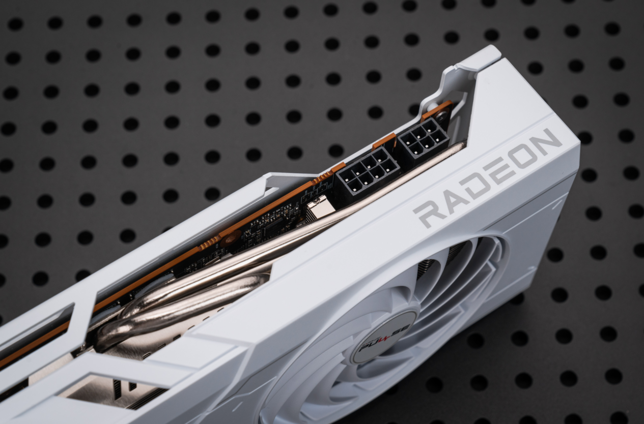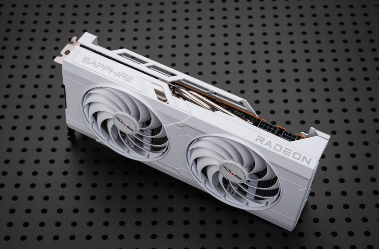 蓝宝石RX 6750 GRE 12G D6极地版主要的卖点在于采用了醒目的白色涂装,散热器外壳凌厉的线条配以表面刻线点缀,整体看上去比较硬派、科技范十足,特别适合搭配白色硬件,打造出白色风格的主机。蓝宝石RX 6750 GRE 12G D6极地版的体积在双风扇显卡中不算小巧,但是长度较三风扇产品还是要短,依然拥有很好的机箱兼容性。