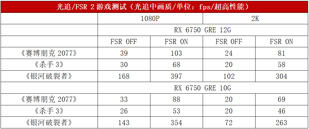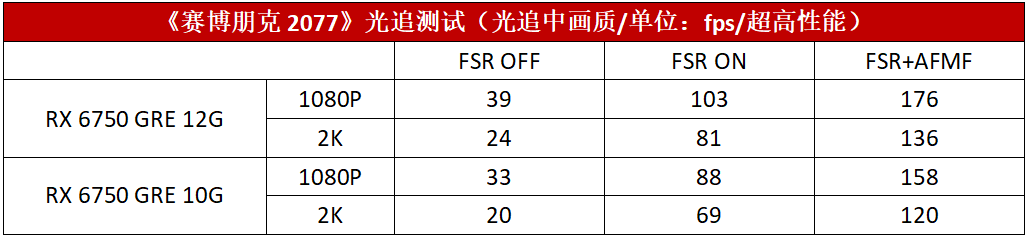RDNA系列显卡的杀手锏是FSR功能,能够大幅提升在光追游戏大作中的表现。接下来我们选取了几款支持光线追踪和FSR的3A大作对RX 6750 GRE 10G和RX 6750 GRE 12G进行性能测试。