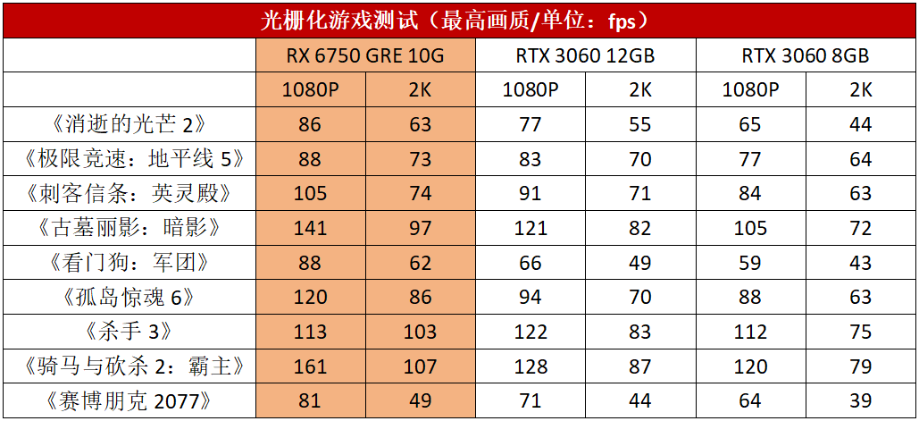值得关注的是,在《杀手3》中,1080P分辨率下,RTX 3060 12GB和RTX 3060 8GB的成绩还领先或基本与RX 6750 GRE 10G持平,不过到了2K分辨,就瞬间被拉开了差距。再结合RX 6750 GRE 10G在2K分辨率下的平均领先幅度还提升了,可以看出这款显卡在2K分辨率下具有更强的竞争力。