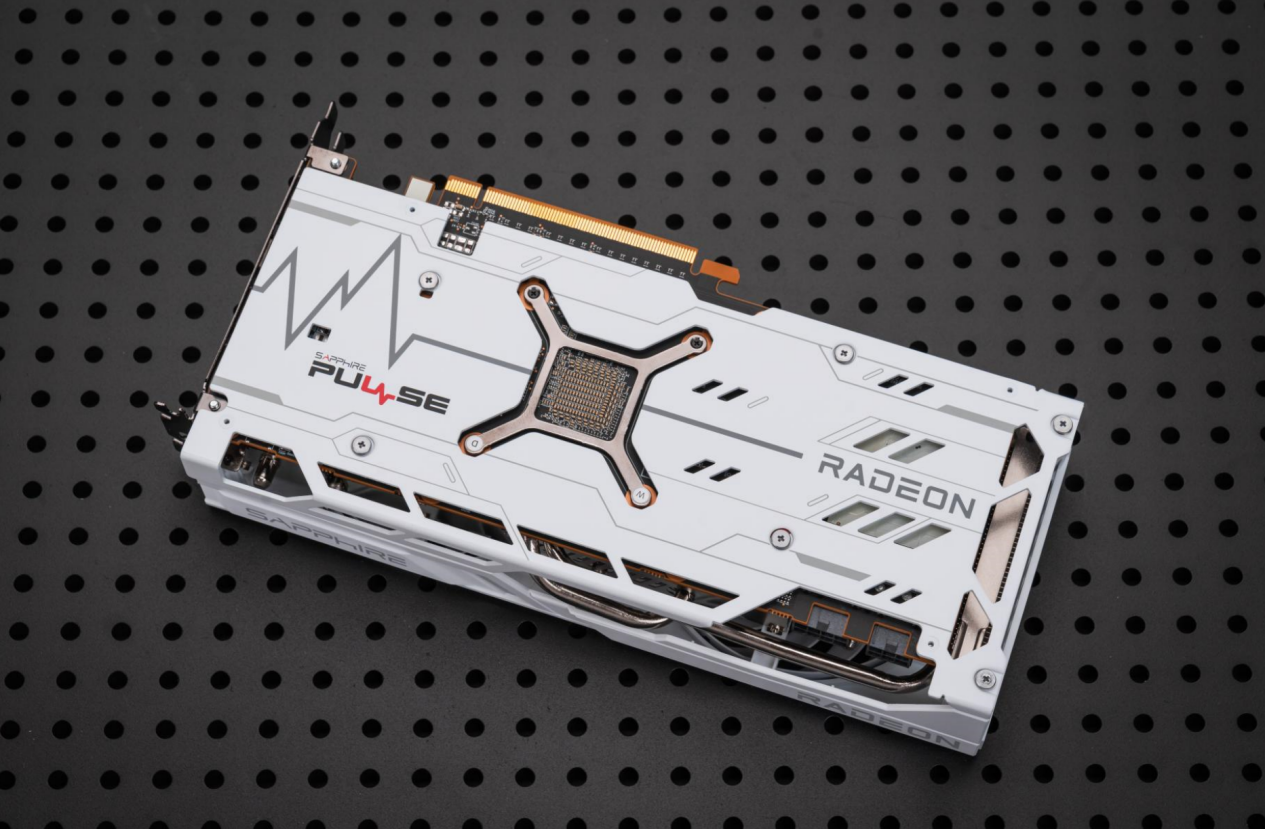 显卡背面全尺寸的金属背板也能起到一些辅助散热的作用,在尾部区域还做了镂空处理,进一步增加散热来协助快速降温。同时在背板上,我们也能见到蓝宝石显卡上熟悉的心脏跳动线做装饰,视觉效果比较出众。