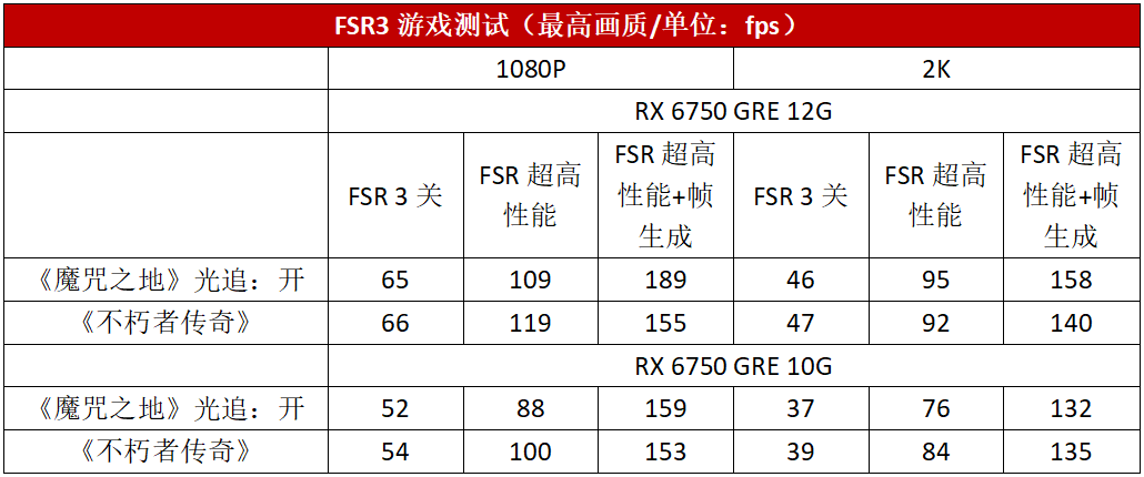 当然RX 6750 GRE 10G和RX 6750 GRE 12G也能支持FSR 3,我们在支持FSR 3的《魔咒之地》以及《不朽者传奇》中进行了测试。我们特别注意到,在2K分辨率下,开启了FSR超高性能模式以及帧生成之后,画面平均帧率都得到了极大的提升。原本平均帧率不足60fps,都提升到了130fps以上,流畅玩转这两款游戏毫无压力。