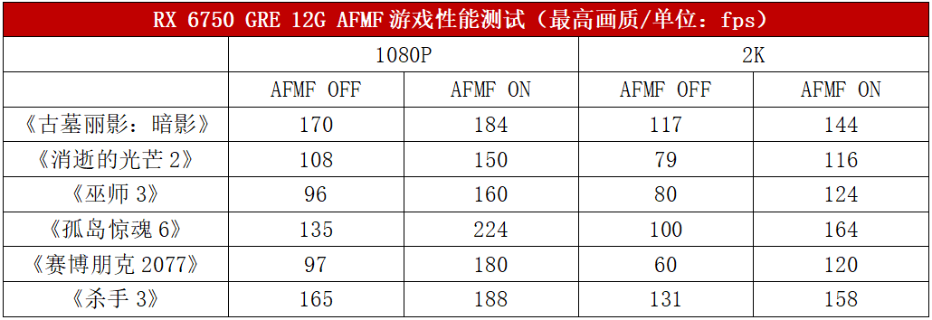 从测试中可以看到,开启了AFMF技术之后,RX 6750 GRE 12G的性能表现明显得到了提升:1080P分辨率下平均提升幅度为46%,2K分辨率平均提升幅度为51%。