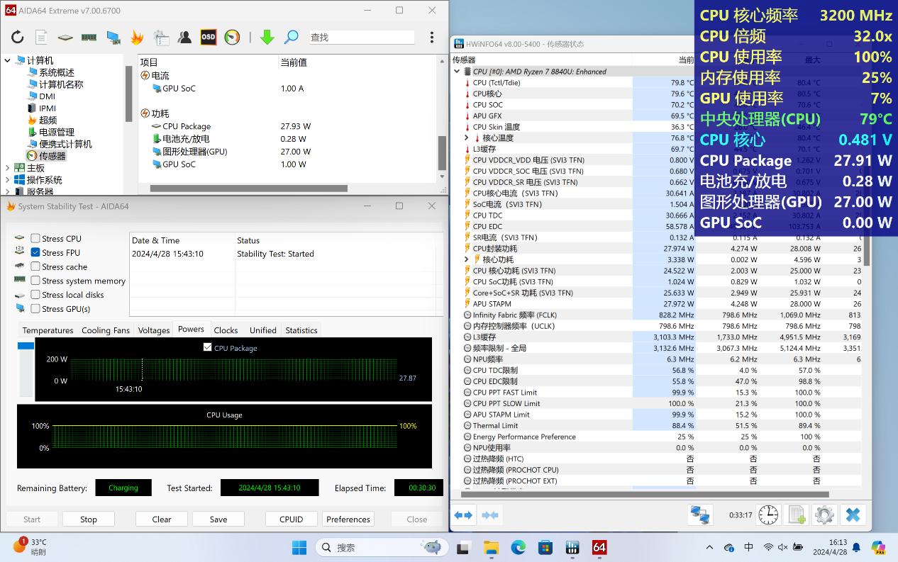 我们对散热压力最大的性能模式进行了具体功耗测试.使用AIDA64 FPU单考之后,铭凡V3的功耗和发热情况都非常稳定,考机30分钟后CPU核心温度为79℃,系统功耗稳定在28W左右。测试过程中,处理器未出现降频,核心温度保持稳定。