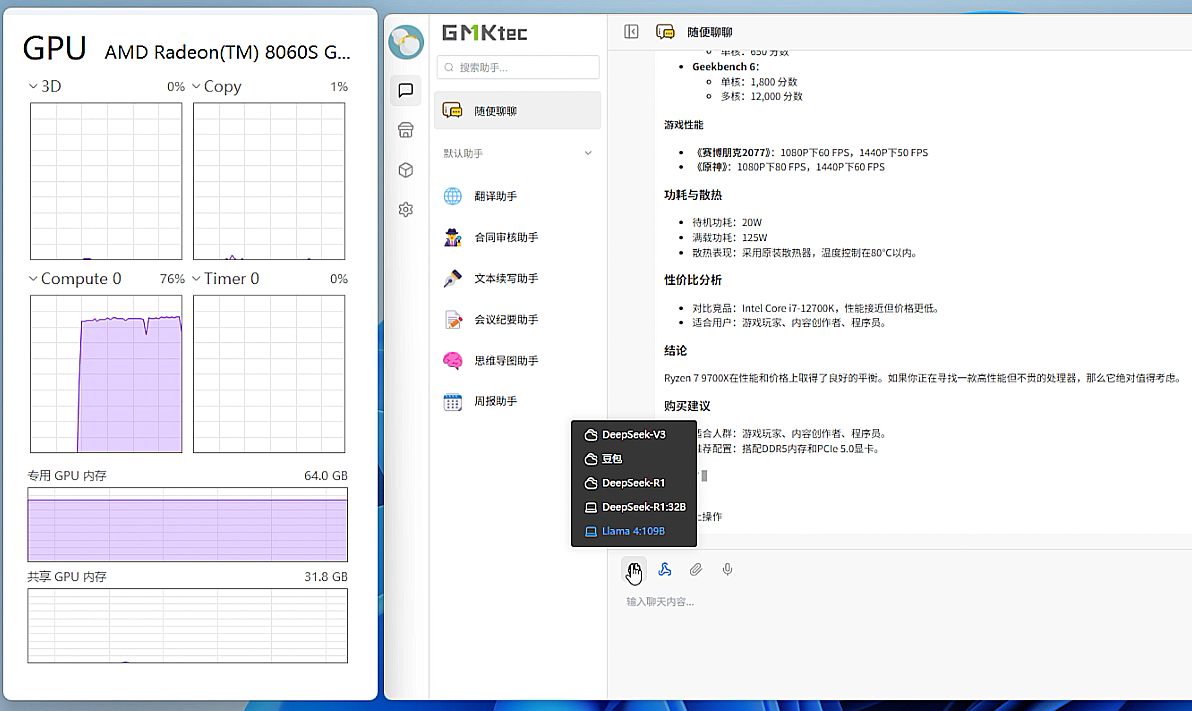 内存部分,锐龙AI MAX+ 395最高支持128GB LPDDR5X 8000统一内存,而且最多支持将96GB内存分配给Radeon 8060S作为独立显存使用,因此可以体验以前不能在本地个人电脑部署的超大模型(例如文生文的109B、70B大模型,文生图的flux模型等等),在开发本地应用时使用LM Studio作为LLM provider endpoint,也可以调用本地32B参数以上的模型。很显然,在本地进行AI计算相比在线模式能够更好地保护用户数据安全和隐私,这对于AI应用开发者来说是非常重要的一点。