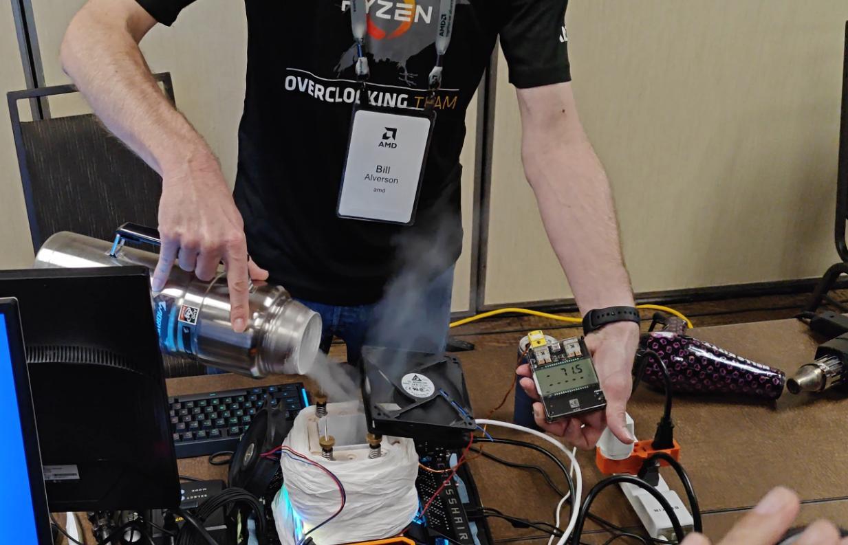 AMD在Tech Day大会上邀请了知名超频高手Bill Alverson来使用锐龙9 9950X液氮/液氦极限超频挑战极限。在添加液氮时,可以看到温度探头实时监测到的温度已经低至-71.5℃,后面更是低于-110℃。此外,Bill Alverson的中文讲得非常不错。