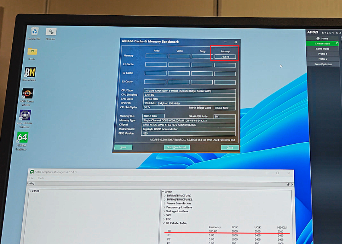 从现场的演示来看,搭载锐龙9 9950X的测试平台内存原本运行在P1的DDR5 4800模式下,此时内存延迟为89.2ns,然后我们只需要在Ryzen Master中进行一键切换配置文件,即可变到P0设置的DDR5 6000模式下,频率和时序参数都同时改变,此时延迟也来到了76.8ns。