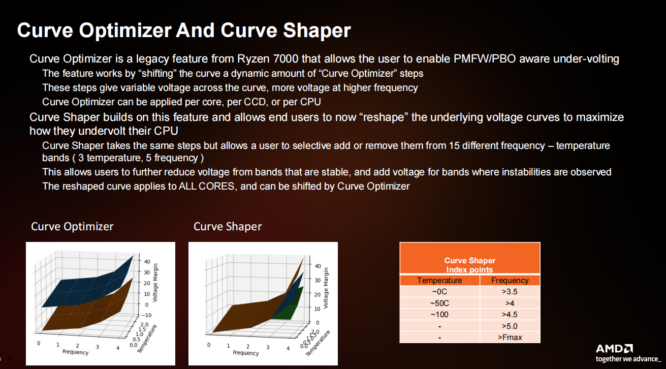 这一次锐龙9000还带来了全新的Curve Shaper功能,在原有的Curve Optimizer功能上提供更加灵活的电压、温度、频率调节。简单来说,我们在使用Curve Optimizer功能时,越高的电压也就对应着越高的频率,从图上看调节过程就是整个曲面上下移动。而Curve Shaper功能则在15种温度与频率组合模式下可以调节电压曲线,从而改变整个曲面的弯曲程度,让处理器可以在更低电压设定下加速到更高频率,实现更低的功耗和温度。当然,Curve Shaper功能和Curve Optimizer功能也可以一起使用。