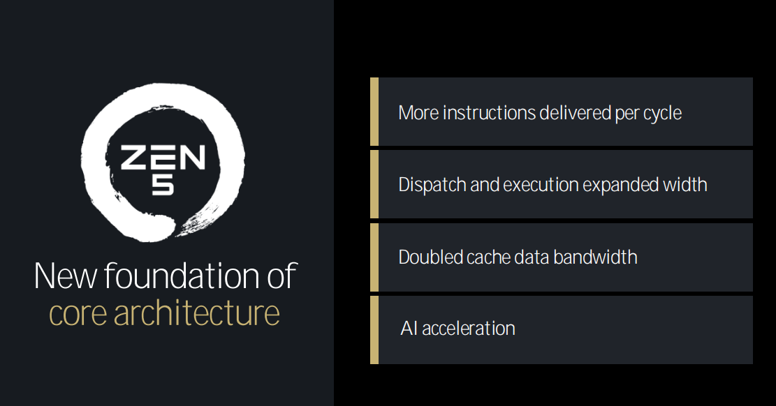 整体来说,Zen5架构的升级包括了四大方面。第一,每个周期可以处理更多的指令;第二,分发和执行带宽得到了提升;第三,将缓存数据带宽翻倍;第四,提供AI加速。