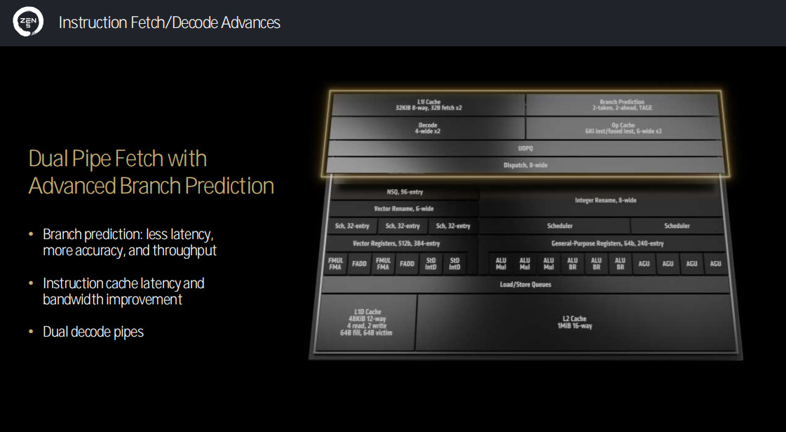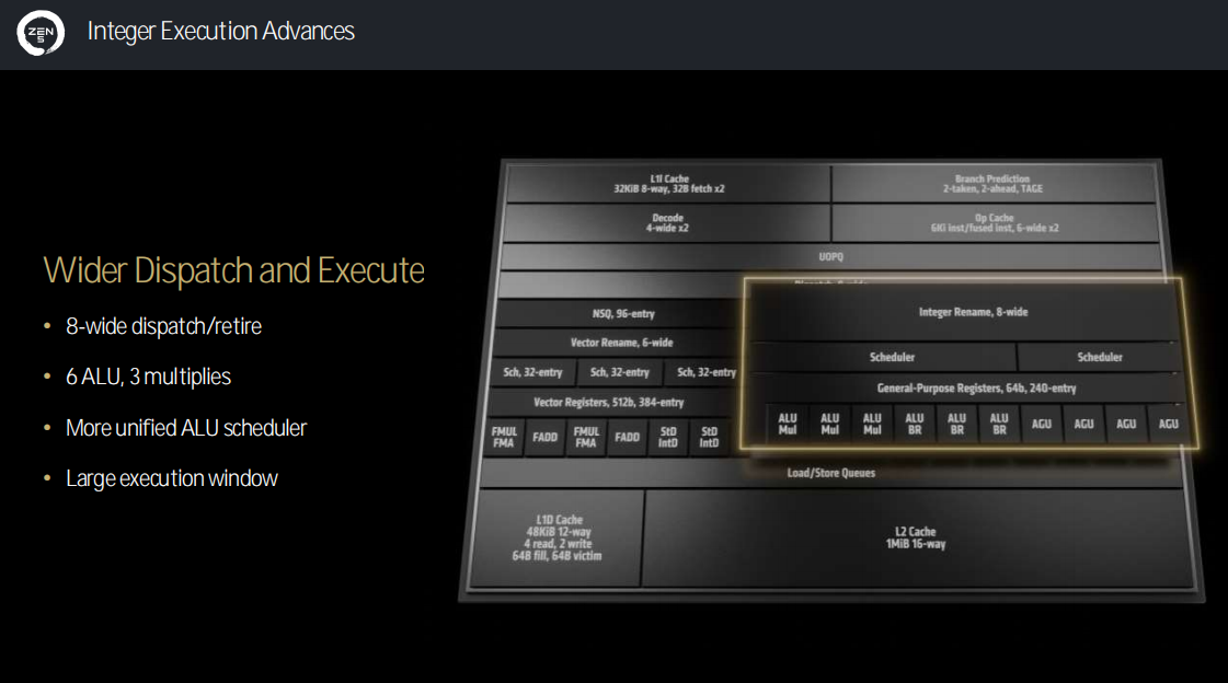前端部分,在指令取/解码的升级方面,Zen5架构带来了双管道获取以及高级分支预测。分支预测拥有了更低的延迟、更高的准确度与吞吐量;指令缓存响应速度与带宽都得到了提升;提供双解码管道。
